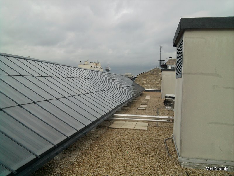 La surface des panneaux étaient limitées par la place disponible. Les locaux de chaufferies réduisent ainsi l’espace mais c’est grâce à ces locaux que l’opération a été possible en effet le règlement parisien interdit de surélever les bâtiments y compris pour mettre des énergies renouvelables… Bien que le bâtiment appartiennent à Paris Habitat l’office parisien d ‘HLM sans ces constructions de locaux chaufferie sur le toit de l’immeuble ils n’auraient pas obtenu le permis pour poser le système solaire.
